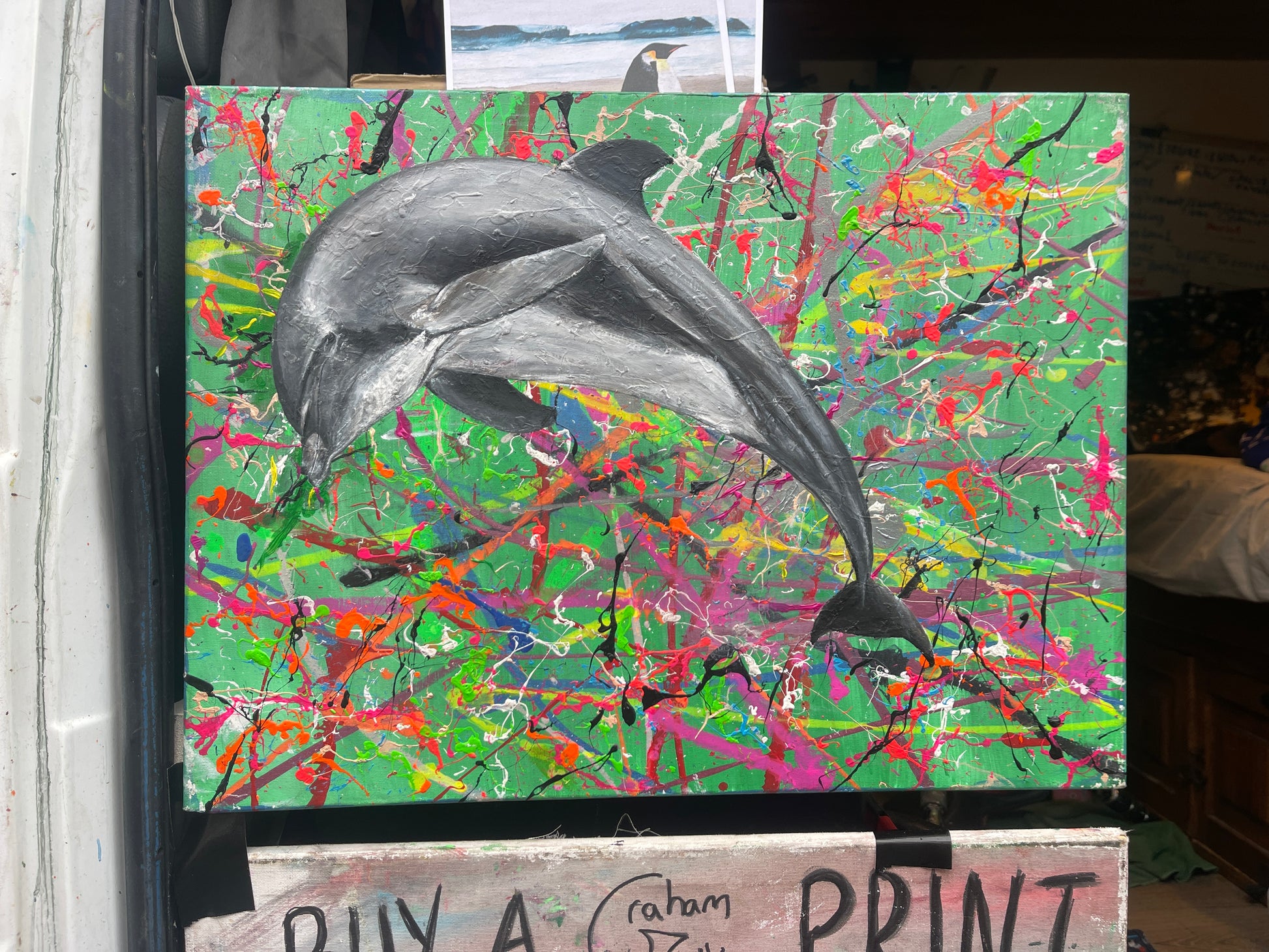Each town of the tour will have a collaborative canvas, splatted and splashed with colour by the community who attend. All the emotions that people bring to the event whether they be happy sad love or anger will be conveyed in the splattered backdrop. I then respond to it with my own painting inspired by my time in each place.