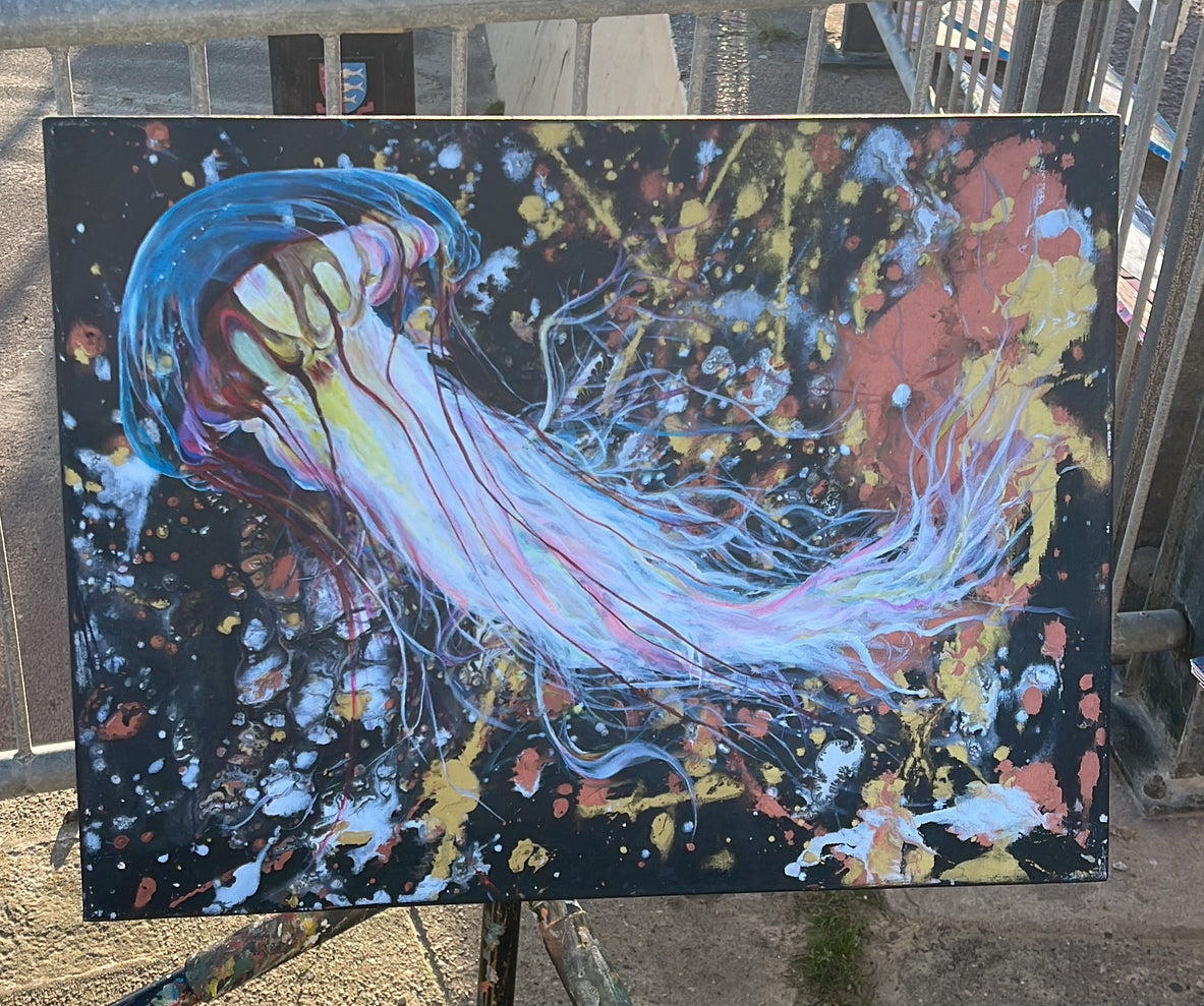 Crosby was a wet and windy event at the Lakeside Marina. instead if a crazy splat session I opted to place a canvas primed in black on the floor and let the participants just drop metallic acrylic inks onto the surface. The wind and the rain made the end result all spacey. So I just had to paint a sparkly jellyfish.